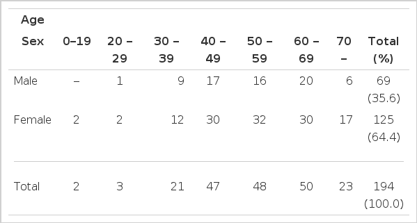 The majority of patients (145 patients; 74.7%) were in the fifth to seventh decades of life. There were 69 male patients (35.6%) and 125 female patients (64.4%).
