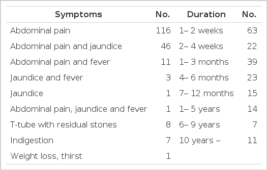 Abdominal pain was the presenting symptom in 174 (89.7%) patients, jaundice in 51 (26.3%) patients, and fever in 15 (7.7%) patients. Eight patients displayed residual stones on T-tube cholangiography. The duration of the chief complaints was variable from days to decades.