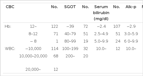 Blood hemoglobin levels were above 12 g/dl in 122 cases, 8 to 12 g/dl in 71 cases, and less than 8 g/dl in 1 case. White blood cell counts were less than 10,000/mm3 in 114 cases, 10,000 to 20,000/mm3 in 68 cases, and above 20,000/mm3 in 12 cases. Serum glutamic oxaloacetic transaminase levels were below 40 Interntional Units (IU)/ml in 72 cases (37%), 100 to 199 IU/ml in 32 cases and above 200 IU/ml in 20 cases. Serum total bilirubin levels were over 5 mg/dl in 36 cases and less than 2.5 mg/dl in 107 cases (55%). Serum alkaline phosphatase levels were below 3 Bessey-Lowry units in 35 cases (18%) and over 6 B-L units in 119 cases (61%). Liver scans showed normal findings in 61 cases, diffuse enlargement of the liver in 72 cases, and cirrhosis of the liver in 3 cases. In 52 cases (27%) a liver scan was not performed.