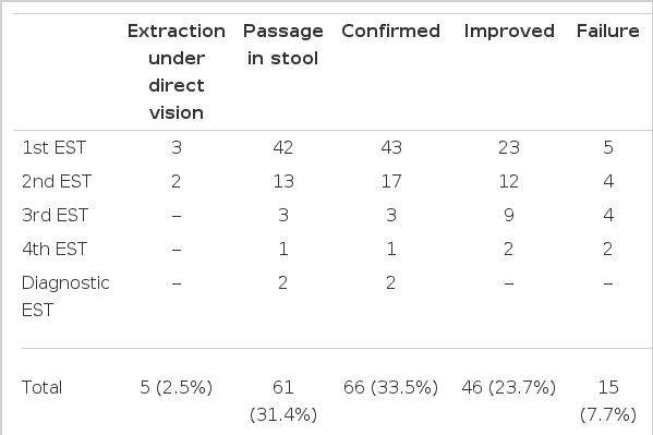 In 116 patients EST was performed once, in 49 patients twice, in 19 patients three times, and in 6 patients four times. In the 4 patients whose biliary trees were not visualized by ERCP, EST was performed for diagnostic purposes. The papillotome was inserted accurately into the common bile duct, common bile duct stones were visualized by ERCP, and then EST allowed the removal of the stones. Stones were extracted under direct visualization from 5 patients (2.5%), and were found in the stools of 61 patients (31.4%). Stone elimination was confirmed by repeated ERCP or T-tube cholangiography in 66 patients (33.5%). Not all stones were removed from 46 patients (23.7%), and improvement was noted only in symptoms and laboratory findings. EST failed in 15 cases (7.7%), and 1 patient (0.5%) died following the procedure. Hence, stone elimination was confirmed in 132 cases (68.0%). Including the 46 cases in which improvement was noted only in symptoms and laboratory findings, EST is thought to have been performed successfully in 178 patients (91.8%).