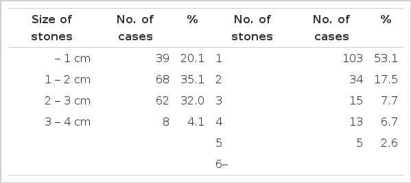 The size of the stones was less than 1 cm in 39 cases(20.1%), and ranged from 1 to 3 cm in 130 cases(67.0%). In 103 cases(53.1%) only 1 stone was found, while in 7 cases, 6 or more stones were found.