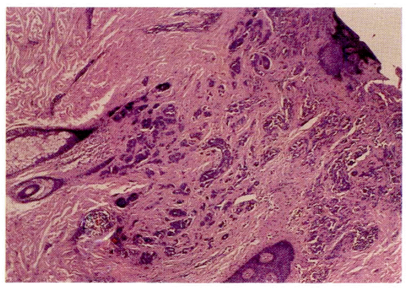 In February, 1986 she had been diagnosed as stage I malignant melanoma of the left cervical region which was treated with wide excision and left radical neck dissection. The pathologic report revealed it to be Clark’s level IV and 5 mm in thickness (Fig. 1). Since then she had been followed regularly through the outpatient department without any evidence of recurrence.