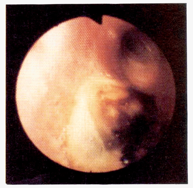 Fiberoptic bronchoscope photography showing a fungating dark grayish endobronchial mass at the orifice of the left lower lobe bronchus