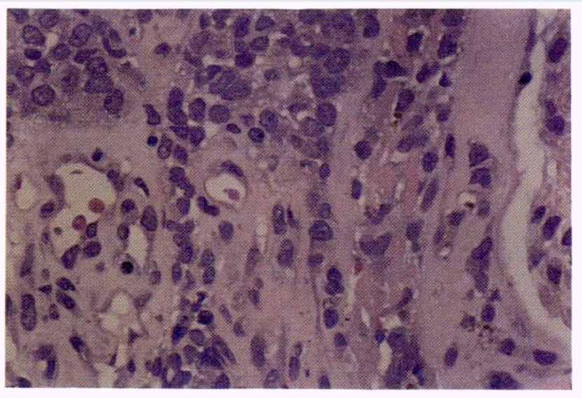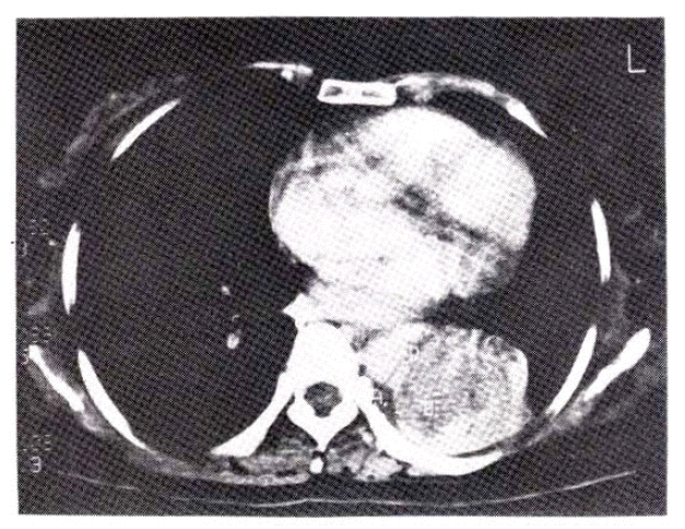 Five weeks before admission she began to cough up blood-streaked sputum. In a recumbent position she suffered from mild dyspnea and wheezing respiration intermittently. Ten days before admission she coughed up frank blood. At the time of admission, the physical examination revealed wheezing and decreased breath sounds in the left lower lung field. Mucocutaneous lesions and palpable lymph nodes were not present. Chest roentgenogram showed left lower lobe collaps (Fig. 2). Laboratory data were normal except for lactic dehydrogenase (LDH) of 414 IU/L. Liver scan was normal. Four repeated sputum cytologic examinations were negative for malignant cells. Pulmonary function tests showed a moderate restrictive pattern. On bronchoscopy, a fungating, dark grayish, irregularly surfaced endobronchial mass at the orifice of the left lower lobe bronchus nearly completely occluding the lumen (Fig. 3) was found. Bronchoscopic biopsy revealed metastatic malignant melanoma (Fig. 4). Computed tomography of the chest showed left lower lobe collapse and aortic invasion (Fig. 5). So palliative chemotherapy with dimethyl triazeno imidazole carboxamide (DTIC) was given as a five day schedule and she was discharged.