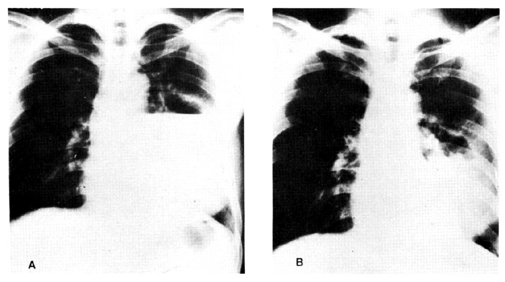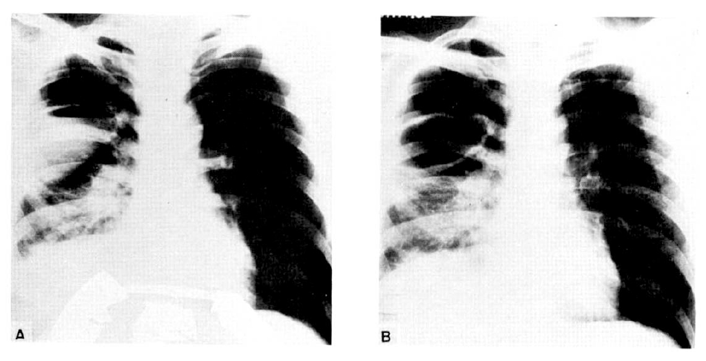 (Patient No. 2): (A) Chest PA shows an abscess with a high air-fluid level; the lesion was located in the superior segment of the right lower lobe, and was intractable to postural drainage and antibiotic therapy. (B) After fiberoptic bronchoscopy and catheter drainage, a dramatic effect is noted in this film taken 4 hours later.