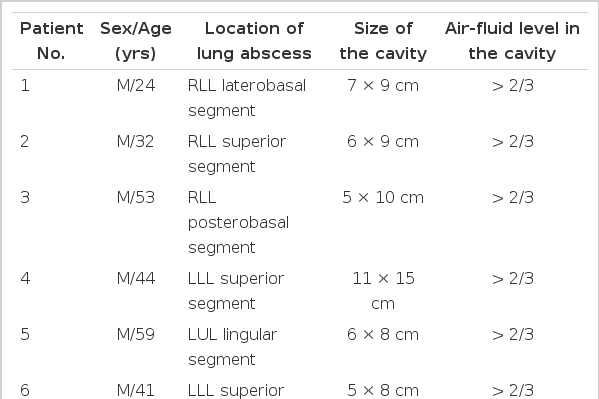 On admission to the hospital, all patients had chest roentgenograms (posteroanterior and lateral) and cultures of expectorated sputum for bacteria, fungi and acid-fast bacilli were performed. Efforts were made to collect these specimens prior to the initiation of antimicrobial therapy. After cultures, various antimicrobial combination therapies with penicillin, clindamycin, aminoglycoside or cephalosporin were empirically started with postural drainage and chest physiotherapy according to the location of lung abscess by chest roentgenograms. Subsequently, the selection of antibiotics was optimally changed on the basis of the identification of the offending organism and its in vitro antibiotic susceptibility patterns. The body temperature and other clinical manifestations were checked daily and chest roentgenograms were followed at 24 or 48 hour intervals.