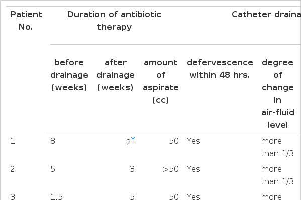 As shown in Table 2, prolonged antibiotic therapy after the catheter drainage was necessary even in the successful group, suggesting that antibiotic therapy without drainage is ineffective in lung abscess. In regard to complications, minute hemoptysis occurred in 5 patients and stopped spontaneously within 48 hours. Hemoptysis was not related to the amount of aspirated pus but might have been due to irritation of the abscess wall by the catheter tip.