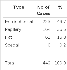 The morphology of the duodenal papilla was diverse and on classification of 449 normal cases by type and incidence, the hemispherical type (49.7%) was the most common, followed by the papillary type (36.5%) and flat typo (13.8%) (Table 1).