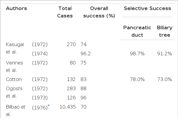 ERCP was perormed in the usual way using the Olympus JFB2 or B3 side-viewing duodenscope on patients premedicated with 1/150 grain of atropine and 2cc of buscopan intramuscularly 15 minutes before the procedure. Ten cc of Gascon® was given and xylocaine was applied on the pharynx just before the procedure, which was performed under fluoroscopic control, using 50% angiograffin medium.