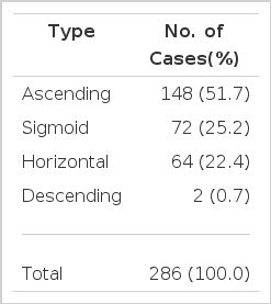 Pancreatic ductal extensions are various in that they can be classified as ascending, horizontal, sigmoid and descending types (Fig. 1). Of 286 cases studied, the ascending type was most prominent at 51.7%, sigmoid type 25.2%, horizontal type 24.2% and descending type 0.7% (Table 3.)