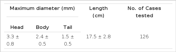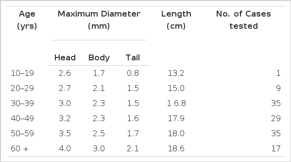 Of the 126 cases measured after classifying the normal pancreatic duct as consisting of a head, body and tail, the largest average diameter was the head at 3.3 ± 0.8mm, the body was 2.4 ± 0.5mm, and the tail was 1.5 ± 0.5mm. The length was 17.5 ± 2.8cm (Table 4).