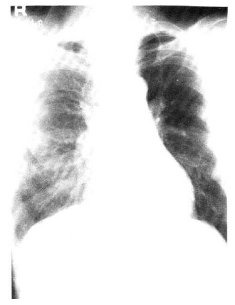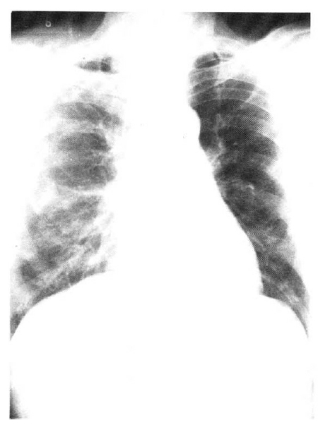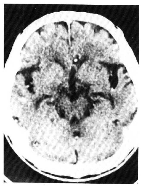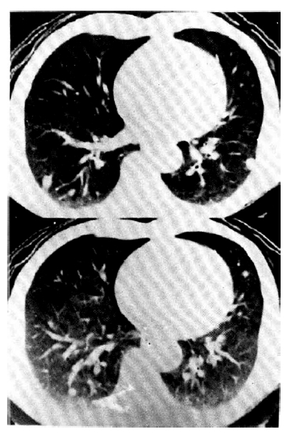 An X-ray film of the chest showed multiple nodular densities throughout both lower lung fields (Fig. 1). A computed tomographic scan of the brain and chest revealed multiple nodular and small calcified densities (Fig. 3, 4).