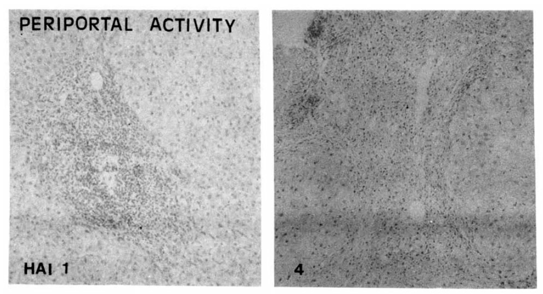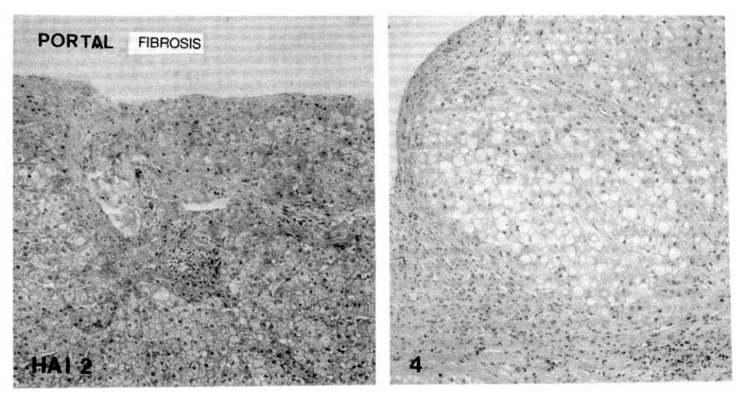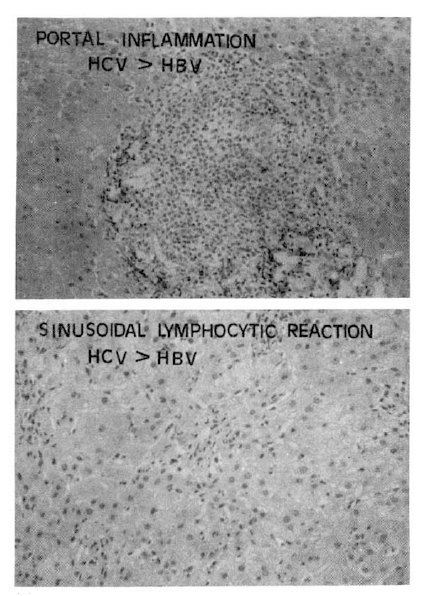 Portal inflammatory cell infiltrations with prominent lymphocytes and follicular arrangement were more frequent in the CAH-C group (10 of 19 cases) than in the CAH-B group (5 of 19 cases). Severe sinusoidal lymphocytic reactions were also more prominent in the CAH-C group (11 of 19 cases) than in the CAH-B group (6 of 19 cases). However, periportal necroinflammation, portal fibrosis, focal hepatic necrosis, regeneration and polyploid nuclear changes were more prominent in the CAH-B group than in the CAH-C group.