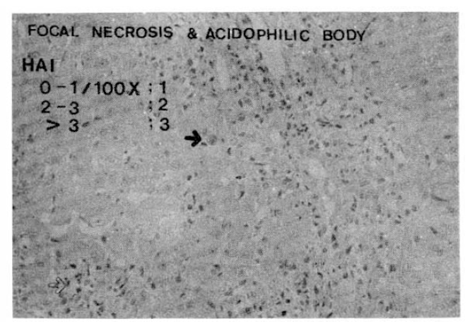 Focal necrosis was observed more frequently as over three foci or confluently in the CAH-B group (63.2%) than in the CAH-C group (31.6%), but there was no significant difference in the morphologic feature of the distribution of an acidophilic body between these two groups (Table 7, Fig. 5).