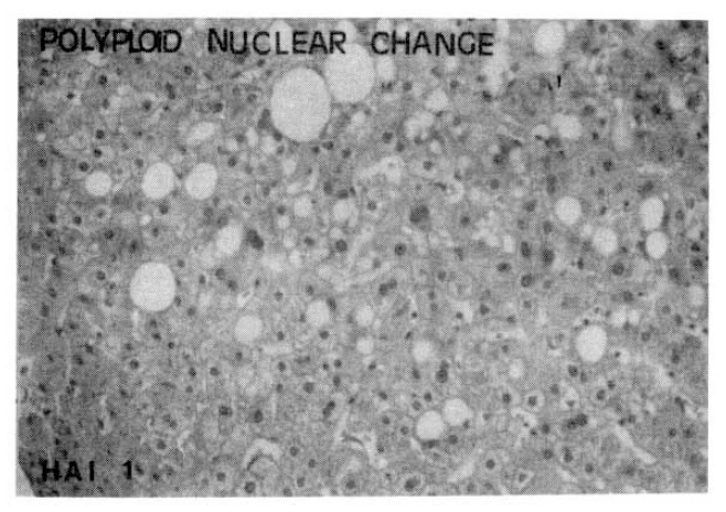 Follicular hepatic regeneration or polyploid nuclear change was noted in 94.7% and 94.7% of the CAH-B group, respectively, whereas only 42.1% and 47.4% of the CAH-C group. Both findings were found more frequently and severely in the CAH-B group (Table 9,10, Fig. 7).