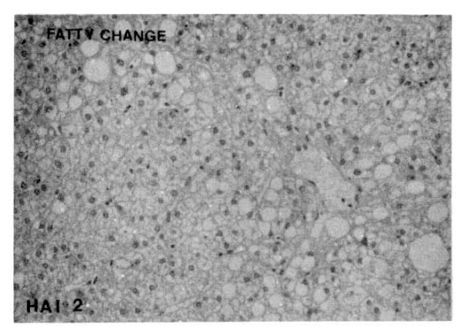 Fatty change could not be detected in 57.9% of the CAH-C group and 68.4% of the CAH-B group, respectively. There was no significant difference in the morphologic feature of fatty cange between these two groups (Table 11, Fig. 8).