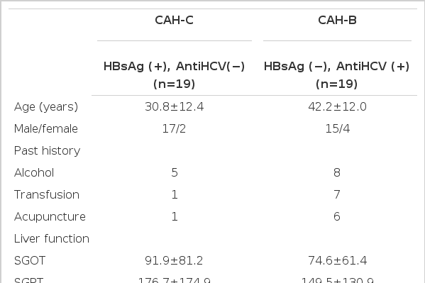The subject population consisted of nineteen patients with chronic active hepatitis C (CAH-C) and nineteen patients with chronic active hepatitis B (CAH-B). The clinical characteristics of the subjects were summarized in Table 1. Diagnosis of chronic active hepatitis was made by peritoneoscopic liver biopsy with the compatible clinical and laboratory findings. Of those patients who had a peritoneoscopic liver biopsy between January 1989 and August 1990 in the Yonsei University College of Medicine, we selected the patients whose blood samplings were cryo-preserved and feasible for hepatitis viral markers study. The subjects were divided into two groups according to the results of the hepatitis viral markers. One group (CAH-C) was the 19 patients who had positive tests for Anti-HCV (EIA, Chiron Co., USA) and negative tests for HBsAg (RIA, Abbott Co., USA). The other group (CAH-B) was the 19 patients who had negative tests for Anti-HCV and positive tests for HBsAg. There were no differences in age, sex, and liver function tests between these two groups, but past medical history such as transfusion and acupuncture was found more frequently in CAH-C group (13 of 19 cases) than in CAH-B group (2 of 19 cases).