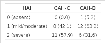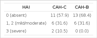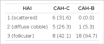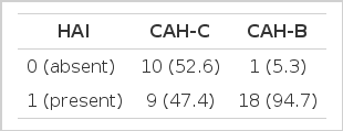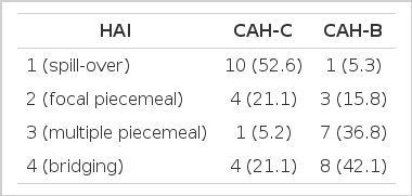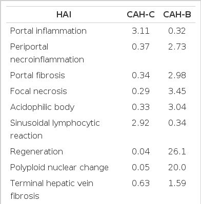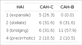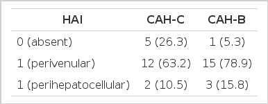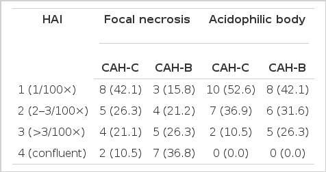 We used the Odds ratio and p value to compare the HAI between the CAH-C and CAH-B groups. Statistical significance was determined when the p value was below 0.05. Odds ratio, which is a classical index used to measure the association and strength of association between the disease and expression, was used to clarify arithmatically the association between the HAI and type of viral hepatitis.