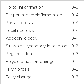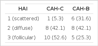 Three pathologists and two physicians reviewed the pathologic slides individually, without previous informations on the patients, and made scores according to the histologic activity index (HAI), modified from Knodell’s proposal7). Histological features were analyzed between the CAH-C and CAH-B groups in terms of portal inflammation (1. scattered, 2. diffuse, 3. follicular), periportal necroinflammation (1. expansile, 2. stellate, 3. bridging, 4. precirrhotic), focal necrosis or acidophilic body (1. 1/100×, 2. 2–3/100×, 3. 3/100×, 4. confluent), sinusoidal lymphocytic reaction (0. absent, 1. mild to moderate, 2. severe), regeneration (1. scattered, 2. diffuse cobble, 3. follicular), polyploid nuclear change (0. absent, 1. present), terminal hepatic vein fibrosis (0. absent, 1. perivenular or perihepatocellular), fatty change (0. absent, 1. mild, 2. moderate, 3. severe) (Table 2).