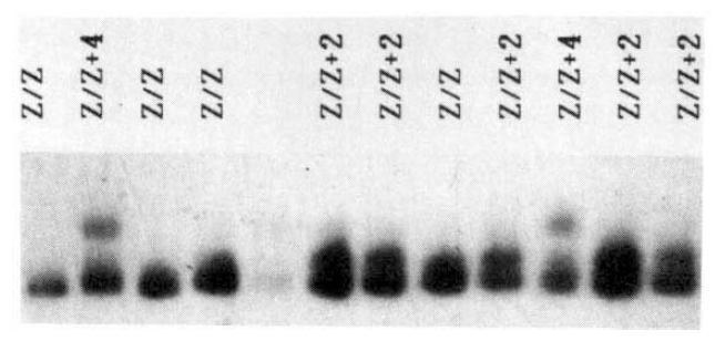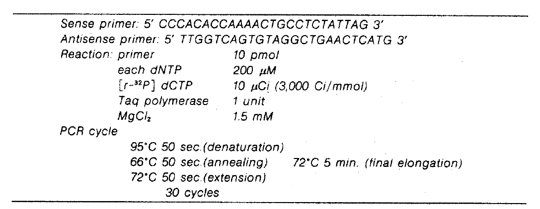 A set of oligonucleotide primers flanking the microsatellite region was used for PCR amplification. Sense primer was 5′-end labeled for 45 min at 37°C in a 25- μl reaction containing 25 pmol primer. T4 polynucleotide kinase. Each PCR assay contained 250 ng intact genomic DNA, 10 pmol antisense primer, 9 pmol unlabeled and 1 pmol 32P end-labeled sense primer, 200 μM each dNTP, 1.5 mM MgCl2, and 1 unit Taq polymerase in 50 μl reaction volume with the buffer supplied in the Gene AMP kit (Perkin-Elmer-Cetus, Norwalk, CT). Sample was processed through initial denaturation for 3 min at 95°C, 30 cycles of amplification, which consisted of 50 sec at 95°C (denaturation) and 50 sec at 66°C (annealing-extension) and final elongation at 72°C for 5 min in Perkin-Elmer-Cetus thermal cycler. After being denatured at 75°C for 2 min in formamide stop solution (50% formamide and 10 mM EDTA), aliquots of amplified samples were run in alternate lanes on a standard DNA sequencing gel containing 6% acrylamide and 7 M urea in 27 mM Tris-borate, 0.6 mM EDTA buffer, for 2.5 h at 70 w. Gels were then fixed, dried and processed for autoradiography.