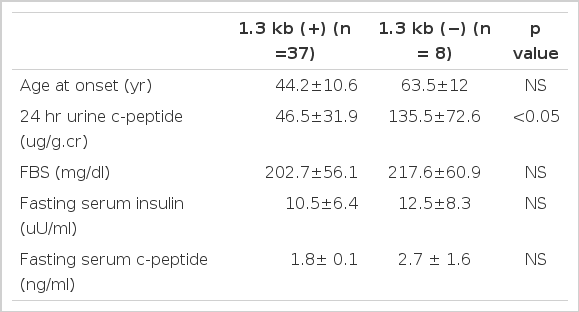 In NIDDM patients, negative 1.3 kb allele was more common than in normal subjects (Table 1). Clinical manifestations according to the RFLP of glucokinase gene, age at onset, fasting blood sugar, fasting serum insulin and c-peptide level were not different between the 1.3 kb allele negative and positive group. However 24 hr urine c-peptide excretion rate was significantly more elevated in the 1.3 kb negative group than in the 1.3 kb positive group. Also, insulin and c-peptide response to oral glucose was more increased in the 1.3 kb negative group than in the 1.3 kb positive group (Table 2).