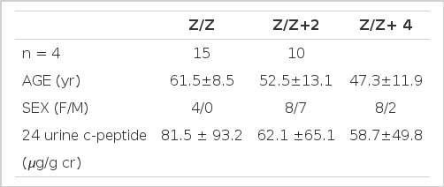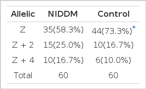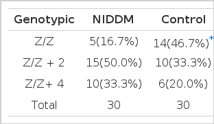 Genotype of microsatellite polymorphic markers was observed, including Z/Z, Z/Z+2, Z+4 (Table 4). In normal control, Z/Z (46.7%) was the most common genotype. Compared to normal control, the frequency of the Z/Z genotype (16.7%) was significantly lower in NIDDM subjects (P<0.05). No differences were noted between the frequency of the other genotypes in the control group and NIDDM (Z/Z+2, 33.3% vs 50.0%, Z/Z+4, 20.0%, vs 33.3%).