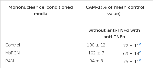 The expression of ICAM-1 was increased by 44% by the addition of CM of MNC(Fig. 1). While there were no differences among groups (Table 1), the ratio of the expression of ICAM-1 to thymidine incorporation was higher in MsPGN and PAN than in Control. Further studies utilizing neutralizing antibody showed that the increased expression was completely prevented by 50μl/ml anti-TNFα antibody(Table 1), and TNFα stimulated the expression of ICAM-1 by 33%.