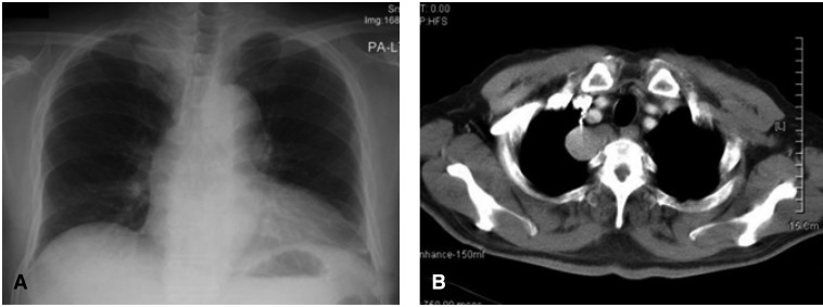 Plain chest roentgenography (A) showed a smooth, marginated 3×4 cm sized mass-like lesion on the right upper mediastinal area. Chest computed tomographic (CT) with enhancement (B) revealed a 2.5×2 cm sized, well defined bilobed, homogeneously enhancing mass lesion, in the right upper posterior mediastinum. No definite evidence of bony erosion of thoracic vertebrae was noted.