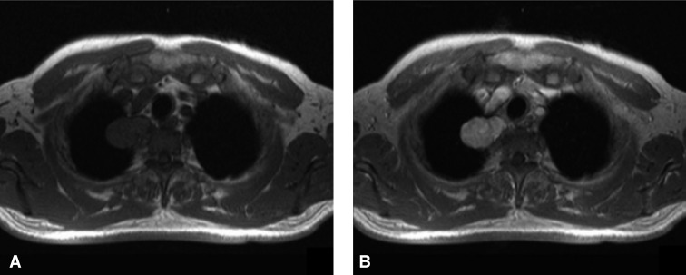 A 64-year-old man was referred to the pulmonary department of Korea University Ansan Hospital for an evaluation of a lung mass. He had received a medical checkup 1 month previously, when the mass-like lesion was incidentally found on plain chest X-ray. He was asymptomatic and had well controlled hypertension and diabetes; he also had a smoking history of 40 pack-years. On physical examination, no palpable lymphadenopathy or other abnormality was noted. His hemoglobin, white cell count, platelets, urea and electrolytes, glucose, liver function tests, and serum calcium were normal. The plain chest X-ray revealed a smooth marginated 3×4 cm sized mass-like lesion in the right upper mediastinal area (Figure 1A). Chest computerized tomographic (CT) studies, performed after the intravenous administration of a contrast agent, revealed a 2.5×2 cm sized, well defined, bilobed, homogeneously enhancing mass lesion in the right upper posterior mediastinum (Figure 1B). No definite evidence of bony erosion of the thoracic vertebrae was observed. On magnetic resonance imaging (MRI), the tumor was visualized as a homogeneous signal intensity mass with a signal intensity similar to muscle on T1-weighted images, whereas on T2-weighted images, the signal intensity was moderately higher than that of muscle. Moderate heterogeneous enhancement was noted with gadolinium-enhancement (Figure 2).