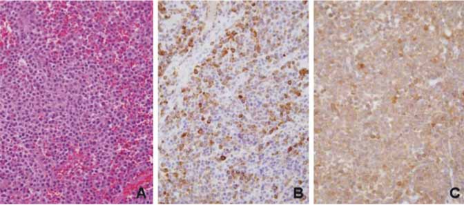 Microscopically, the tumor consisted of extensively infiltrating, diffuse sheets of mature and immature plasma cells with eccentric, pleomorphic nuclei, nucleoli, and variably stained cytoplasm (A) (Hematoxylin and eosin stain, ×400). Immunohistochemical staining showed that the neoplastic plasma cells were reactive for CD79a B-cell marker (B) and had kappa monoclonality (C). (Immunohistochemical stain: CD79a, ×400 and kappa light chain, ×400)