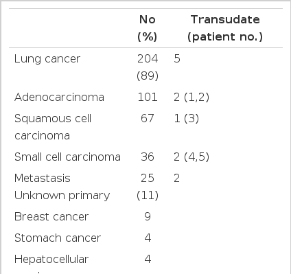 As in other countries, lung cancer is the most common cause of cancer death in Korea. Malignant pleural effusion is defined as pleural effusion associated with cancer and has been a common clinical problem encountered by most clinicians. However, the prevalence of transudates has been rarely reported in malignant pleural effusion. After the initial study by Light et al.6) stating the prevalence of malignant transudative pleural effusion as 2.3% for 43 patients, the prevalence has been reported to range from 1 to 10.6% in other studies1–5). In the largest study to date, by Ashchi et al7), the prevalence was reported as 4.6% among 171 malignant pleural effusion patients. Our series showed a prevalence of transudative malignant pleural effusion of 3.1% for the 229 patients.
