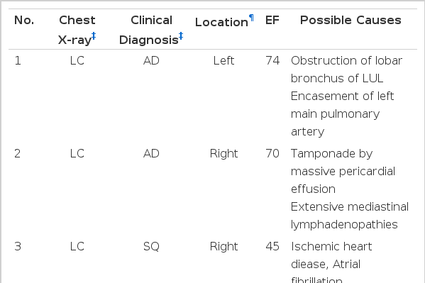 We performed a retrospective study of 229 consecutive patients with malignant pleural effusion, proven either cytologically or with biopsy. In patients with transudative pleural effusion, we reviewed medical records, results of transthoracic echocardiography, fiberoptic bronchoscopy, chest X-ray, chest CT scan, and ultrasonogram of the abdomen. These data were examined with particular attention to identifying whether or not the malignancy was suggested on chest X-ray, examining the involvement of the superior vena cava, great vessels, and lymph nodes, determining the presence of pericardial effusion, and observing the endobronchial obstruction.