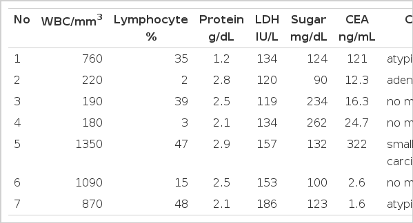 Transudative pleural effusion was observed in 7 (3.1%) of the 229 patients with malignant disease (Table 2). Five patients had primary lung cancer: adenocarcinoma for patients nos. 1–2, squamous cell carcinoma for no. 3, and small cell carcinoma for nos. 4 and 5. Their clinical stages were stage IIIB in all patients. Patient no. 6 had bladder carcinoma with lymphangitic metastasis to both lungs at the time of diagnosis, while patient no. 7 had invasive thymoma. Of the 7 patients, 4 (nos. 4–7) had pleural effusion on initial chest X-ray. In the other 3 patients, pleural effusion was not observed initially, but was disclosed on follow-up chest X-ray after the diagnosis of malignancy. No patients had abnormal values for blood urea nitrogen, creatinine, AST, or ALT on the day of thoracentesis, and none had a history of liver disease or thyroid disease. Lower levels of serum albumin were observed in one patient, no. 1 at 2.7 g/dL (normal range: 3.1–5.2 g/dL) on the day of thoracentesis. Thyroid function was evaluated in one patient (no. 1) with normal results. Abdominal ultrasonogram revealed normal findings in all patients. The level of pleural fluid carcinoembryonic antigen (CEA) was more than 10 ng/mL in 5 patients (nos. 1–5) (Table 3). At initial thoracentesis, the presence of malignancy was suggested for all patients, by chest X-ray or other clinical information.