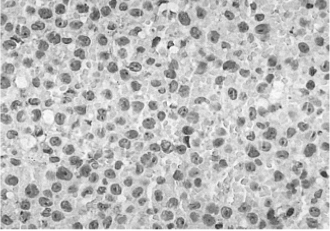 We did a biopsy of the lesion to identify other potential causes. The biopsy established the presence of leukemic cell infiltration including a malignant lymphoma or histiocytic tumor (Figure 3). Muramidase and immunohistochemical stains specific for LCA (Figure 4A), L26 (Figure 4B), UCHL1, and CD68 revealed a large diffuse B cell type of malignant lymphoma. The latent membrane protein for the Epstein-Barr virus (EBV-LMP) immunohistochemical stain was positive (Figure 5).