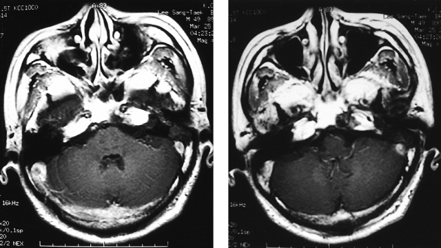 Extraskeletal Ewing's sarcoma is a rare, round-cell, malignant tumor of uncharacterized mesenchymal cell origin that manifests most commonly in the paravertebral and intercostal regions. It occurs predominantly in adolescents and young adults between the ages of 10 and 30 years and it follows an aggressive course with a high rate of recurrence. Distant metastases are also common in extraskeletal Ewing's sarcoma. It was first recognized by Tefft et al in 19691) when he reported four patients with paravertebral soft tissue tumors that histologically resembled Ewing's sarcoma. In 1975, Angervall and Enzinger2) reviewed 39 patients with malignant soft tissue paravertebral tumors not arising from bone but having similar morphologic characteristics to osseous Ewing's sarcoma. The head and neck region is an unusual primary site for this type of tumor and, according to Chao et al.3), there were only five out of 118 cases of extraskeletal Ewing's sarcoma located in the head and neck region.