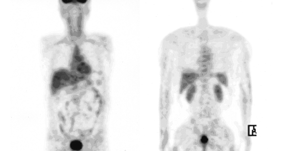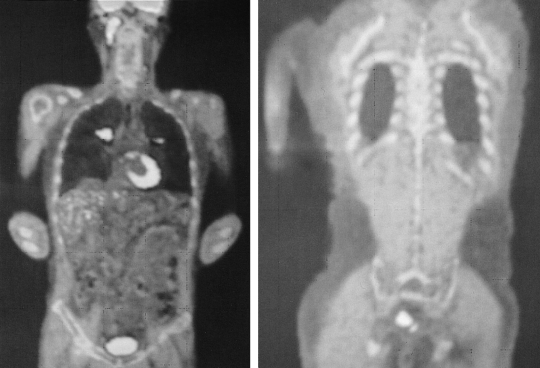 A 49-year-old man presented with a six-month history of diplopia and mild headache. The diplopia was gradually aggravated and blindness developed two months before he visited our hospital. Ophthalmologic examination revealed bilateral papilledema and atropy of the optic nerve. MRI examination showed marked enhancement of the tumor thrombosis involving the superior sagittal sinus, straight sinus, transverse sinus, sigmoid sinus, and internal jugular vein (Figure 1). Additional PET-CT examination showed hypermetabolic lesion of the neck, mediastinal lymph node, lung and rectum in addition to lesions of the head and neck (Figure 2). The patient underwent a gun biopsy of the internal jugular vein thrombosis and a sigmoidoscopic biopsy of the rectal mass. Histopathological examination of the internal jugular vein thrombosis showed a small, round-cell malignant tumor with extensive geographic necrosis (Figure 3). Immunohistochemical studies showed that the tumor cells stained positive for CD99, Vimentin, and CD56, but stained negative for S-100, Desmin, Chromogranin, and leukocyte common antigen (Figure 4). Based on MRI and PET-CT findings, the histological pattern, and the results of the immunohistochemical studies, the final diagnosis was extraskeletal Ewing's sarcoma of the parapharynx with pulmonary metastasis. Histopathological examination of an ulcerative rectal mass showed well- differentiated adenocarcinoma and, therefore, the patient was also diagnosed with rectal cancer (Figure 5). The patient was treated with palliative radiotherapy on the parapharynx and systemic chemotherapy with cyclophosphamide, adriamycin and vincristine, after which Grade IV febrile neutropenia and Grade III diarrhea developed. He could not receive further treatment due to poor tolerance and the toxicity of the treatment. A follow-up examination with PET after 20 months showed that the hypermetabolic lesions of the head, neck and chest disappeared, but no significant interval change was observed in the hypermetabolic lesion of the rectum (Figure 6). The patient's visual acuity, however, did not improve.