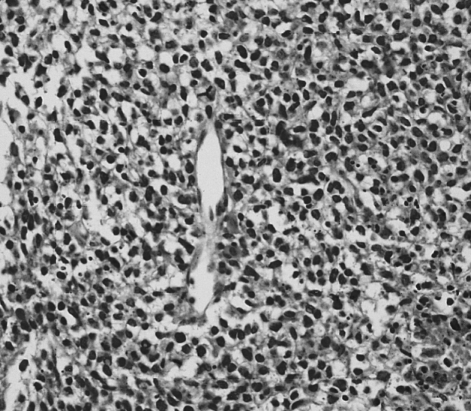 Histopathology showed malignant, small, round cells with prominent nuclei but scanty cytoplasm (H&E stain, ×400).
