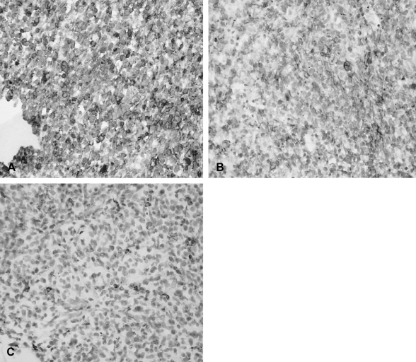 Immunohistochemical studies showed that the tumor cells stained positive for CD99 (A) and CD56 (B), but stained negative for leukocyte common antigen (C) (×400).