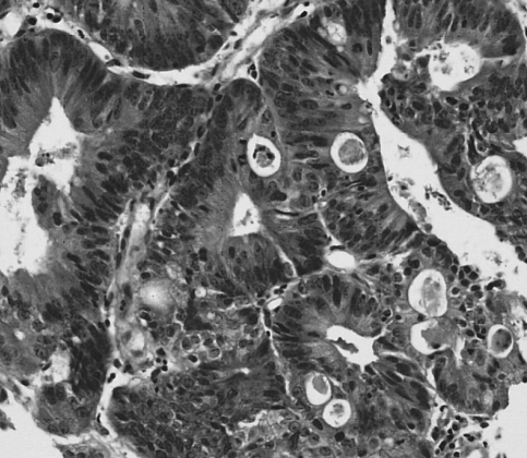 Histopathology of ulcerative rectal mass reveals welldifferentiated adenocarcinoma (H&E stain, ×400).