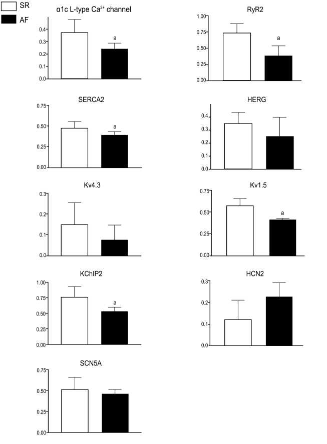 Molecular remodeling: mRNA expression levels in patients with sinus rhythm (SR; blank boxes) and atrial fibrillation (AF; filled boxes). Error bars indicate the standard deviation. ap < 0.05. L-type Ca2+ channel, voltage-gated L-type Ca2+ channel subunit α1c; RyR2, ryanodine receptor; SERCA2, sarcoplasmic reticular calcium adenosine triphosphatase; HERG, gene encoding the rapid component of the delayed rectifier IKr; Kv4.3, gene encoding calciumin-dependent transient outward current Ito1; Kv1.5, gene encoding the ultrarapid component of the delayed rectifier IKur; KChIP2, K+ channel-interacting protein 2; HCN2, hyperpolarization-activated cation channel 2 associated with the pacemaker current If; SCN5A, gene encoding Na+ channel.