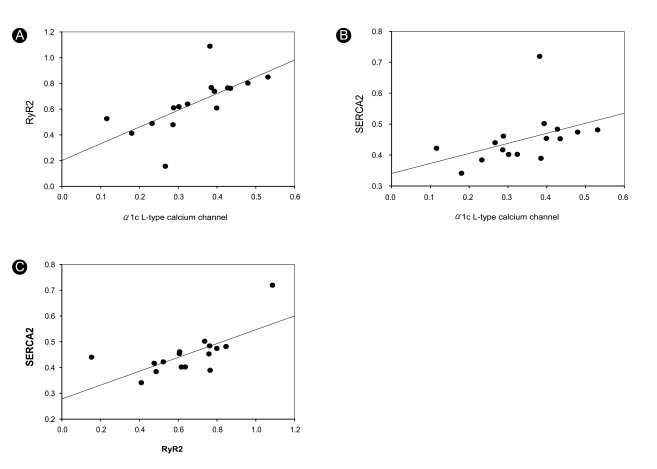 A positive correlation was found between the expression of L-type Ca2+ channels, RyR2, and SERCA2 (Fig. 2): L-type Ca2+ channels vs. RyR2 (p = 0.004, r2 = 0.455) and RyR2 vs. SERCA2 (p = 0.004, r2 = 0.467). L-type Ca2+ channel and SERCA2 expression (p = 0.096, r2 = 0.185) did not exhibit a robust correlation.