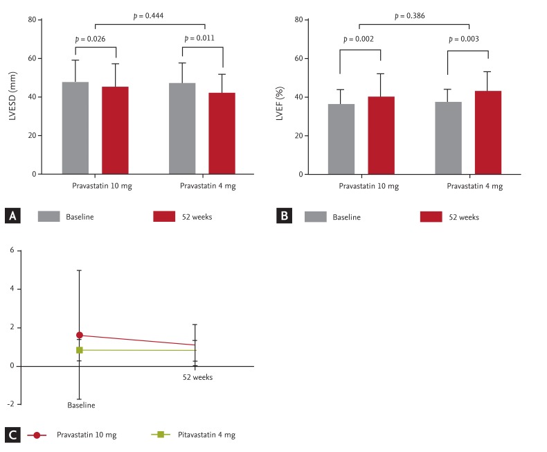 The left ventricular systolic dimensions decreased significantly by 9% in the pitavastatin group (p = 0.011) and by 5% in the pravastatin group (p = 0.026). The difference between the two groups was not significant (p = 0.444) (Fig. 3A).