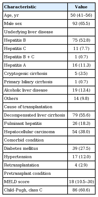 Among 162 liver transplant recipients, 142 patients (87.7%) had both nasal and rectal ASCs at the time of transplantation. The median age was 50 years (interquartile range, 41 to 56), and 65.5% were male. The most common underlying liver diseases were hepatitis B (n = 75, 52.8%), followed by alcoholic liver disease (n = 19, 13.4%), and acute hepatitis A (n = 16, 11.3%). Table 1 shows the demographics for all 142 patients. The detail of patients is displayed in Fig. 1.