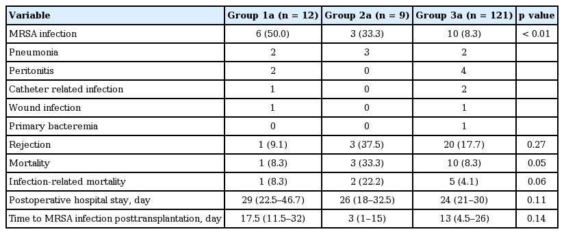 Comparison of clinical outcomes of patients who were initially colonized with MRSA (group 1a), acquired MRSA posttransplantation (group 2a), and were not colonized with MRSA (group 3a)