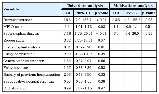 Previous studies have indicated that the risk factors for MRSA colonization include severity of patients, prior antimicrobial use, presence of invasive medical devices, and prolonged ICU stays [20,21]. In this study, the factors associated with acquiring MRSA posttransplantation were underlying liver disease, MELD score, pretransplant dialysis, and retransplantation, although only retransplantation was statistically significant according to the multivariate analyses. Invasive procedures such as pretransplant dialysis and retransplantation result in longer hospital stays. Furthermore, a high MELD score or retransplantation may be indicative of a severe condition requiring more intensive care. Both scenarios increase the likelihood of MRSA transmission.