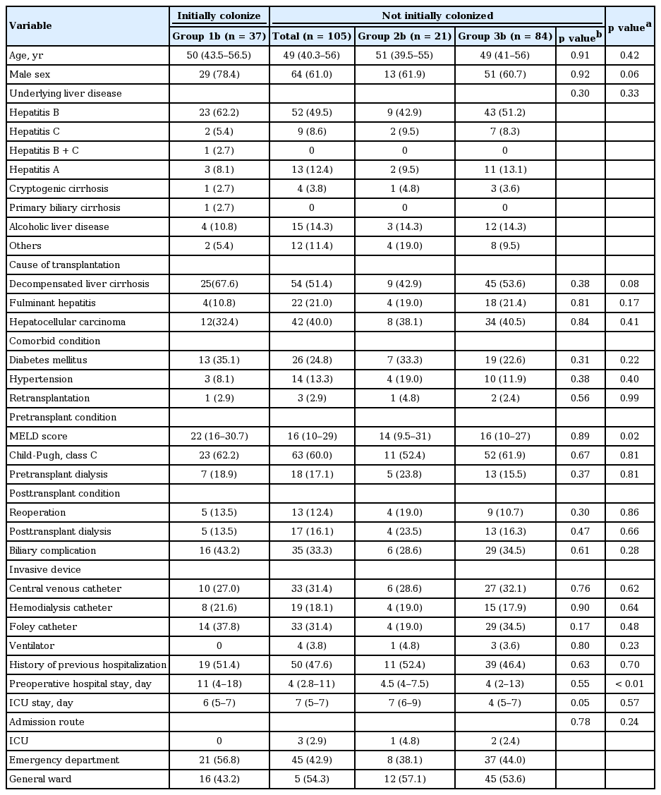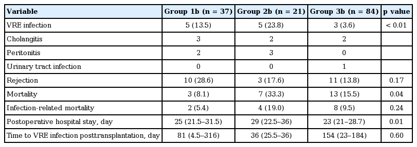 Comparison of patients who were initially colonized with VRE (group 1b), acquired VRE posttransplantation (group 2b), and were not colonized with VRE (group 3b)