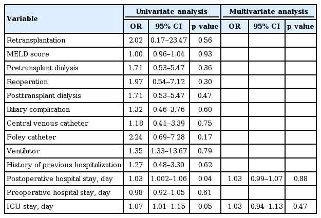 Univariate analysis indicated that the risk factors for VRE acquisition posttransplantation were the length of ICU stay (OR, 1.07; 95% CI, 1.01 to 1.15; p = 0.05) and the length of postoperative hospital stay (OR, 1.03; 95% CI, 1.002 to 1.06; p = 0.04). However, these were not statistically significant as indicated by the multivariate analysis (Table 7).