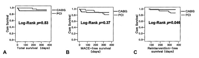 Our study has several important limitations. This study was a single-center, non-randomized, uncontrolled registry that requires validation by prospective randomized studies. Consequently, systematic comparison of long-term outcome was not available. The rate of MACE may be underestimated because of the absence of follow-up angiography and patient refusal of follow-up angiography and the possibility of silent ischemia. As only periprocedural, one-year and three-year outcomes were analyzed, a long-term follow-up study will be necessary to confirm our findings. Van Domburg et al. reported that a slight benefit, up to ten years, in favor of CABG among a diabetic subgroup was comparable to the results in the BARI trial. However, after ten years, both survival curves converged29). Another important limitation is that comparative studies of CABG and PCI can rapidly become outdated in view of evolving medical and technological procedural improvements. For example, triple therapy with antiplatelet agents (aspirin, clopidogrel and cilostazol), adjunctive use of glycoprotein IIb/IIIa inhibitor, new antirestenosis therapies such as DES, and coronary brachytherapy may reduce the need for reintervention and improve long-term outcome. In addition, surgical techniques for CABG continue to improve.