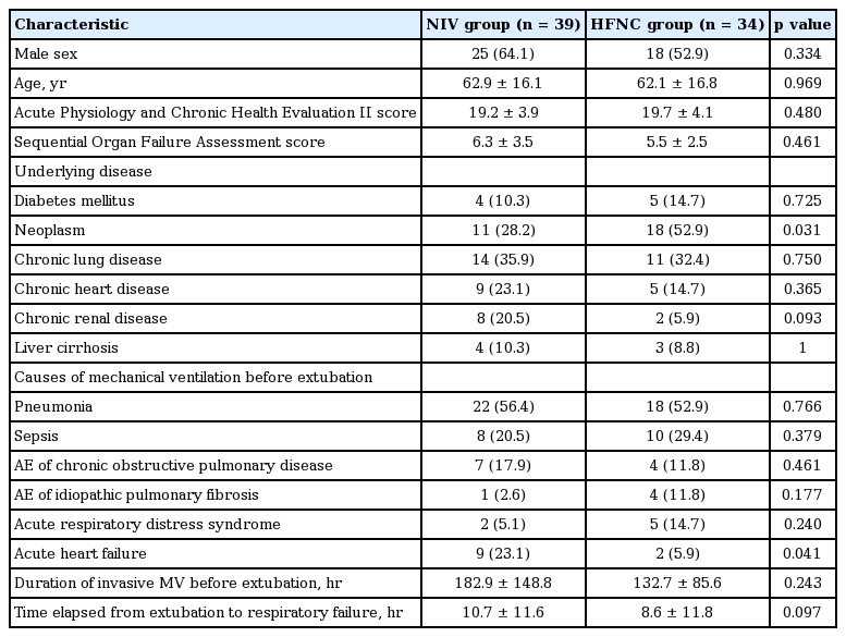 A total of 73 patients were enrolled in this study: in the first-period group, 39 patients underwent NIV for the treatment of PERF, while in the second-period group, 34 subjects were treated by HFNC. Of all patients, 43 patients (58.9%) were males. Their age was 62.6 ± 16.3 years. The baseline characteristics of the enrolled patients are shown in Table 1. There was no significant difference in gender, age, or Acute Physiology and Chronic Health Evaluation II or Sequential Organ Failure Assessment score between the two groups. The proportion of neoplasm as an underlying disease was higher in the NIV group than the HFNC group. Acute heart failure was a more common cause of acute respiratory failure in the NIV group than in the HFNC group. Duration of invasive mechanical ventilation until extubation did not differ between the two groups. There was a trend toward shorter duration from extubation to the onset of respiratory failure in the HFNC group.