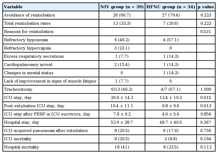 Avoidance of reintubation, duration of ICU and hospital stay, ICU and hospital mortality rates, and incidence of ICU-acquired pneumonia associated with PERF were evaluated and compared between the two groups. Device intolerance was defined as patients’ refusal of continuous use of devices. The avoidance of reintubation was defined as no reintubation due to respiratory failure after applying HFNC or NIV during the ICU stay.